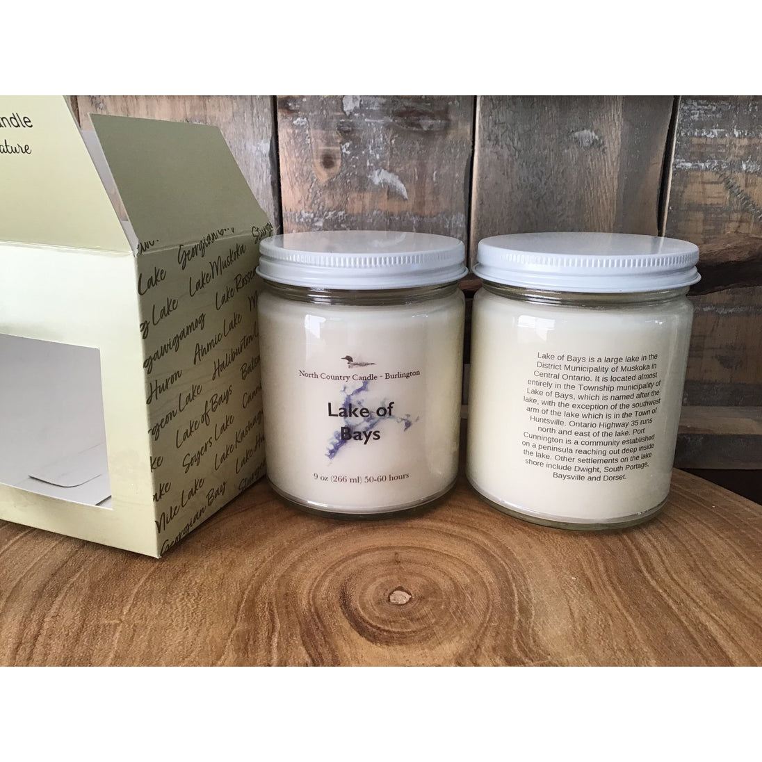 Each candle has a lake history on reverse side of the jar. Comes in a lake-themed gift box.