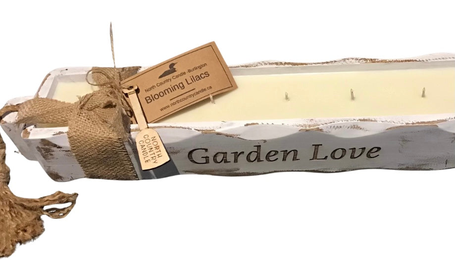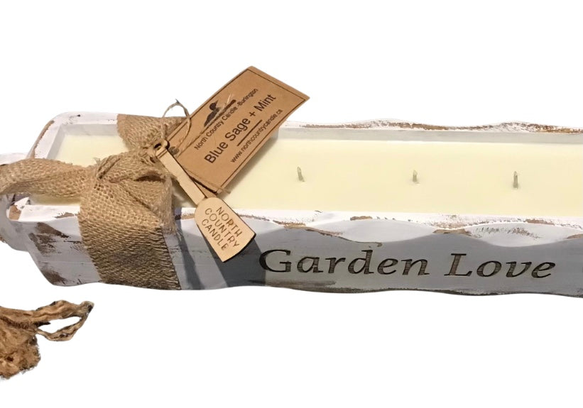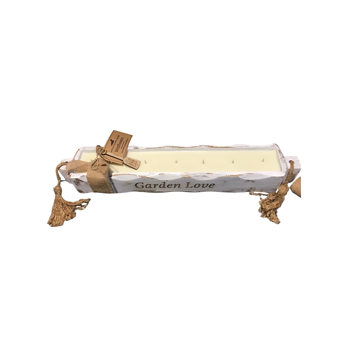 Our 21”x3”x3” distressed candle tray has been hand-poured in eco-friendly, non-toxic soy wax. This tray has been laser-engraved with Garden Love.