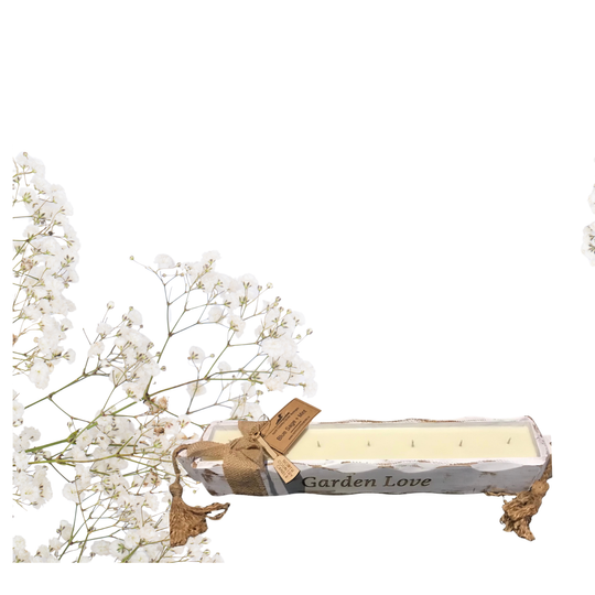 Our distressed linen mango wood trays have been laser-engraved for mom’s special day. This custom-designed tray measures 21”x3”x3” and hold appropriate 22 oz of non-to ic, eco-friendly soy wax.