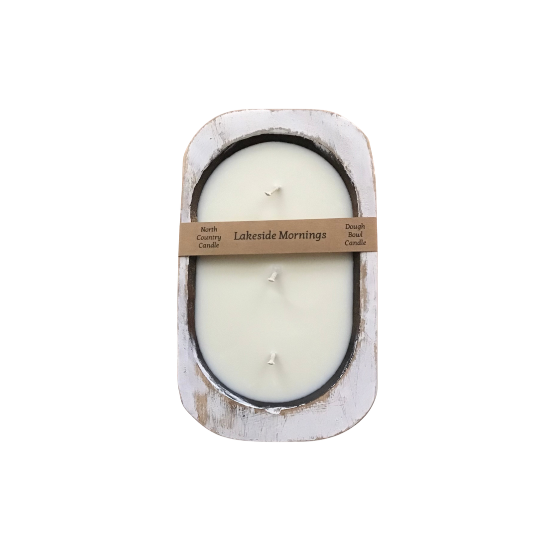 Lakeside Mornings - Distressed Dough Bowl Candle has been distressed to create a vintage look in the bowl. Our distressed linen bowl measures 9.5” x 5.5” x 2.5”. This rounded edge bowl is a beautiful addition to a coffee table or entry hall table.