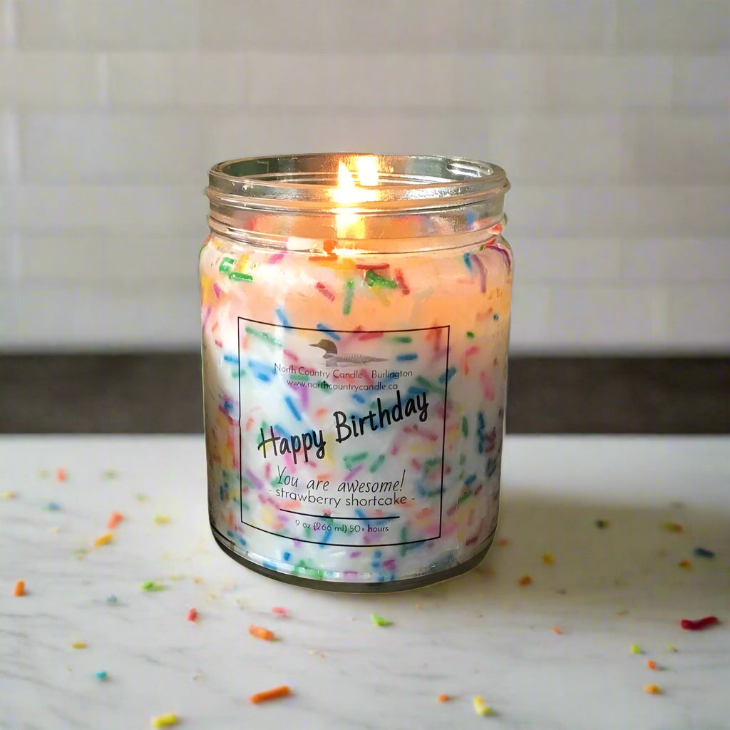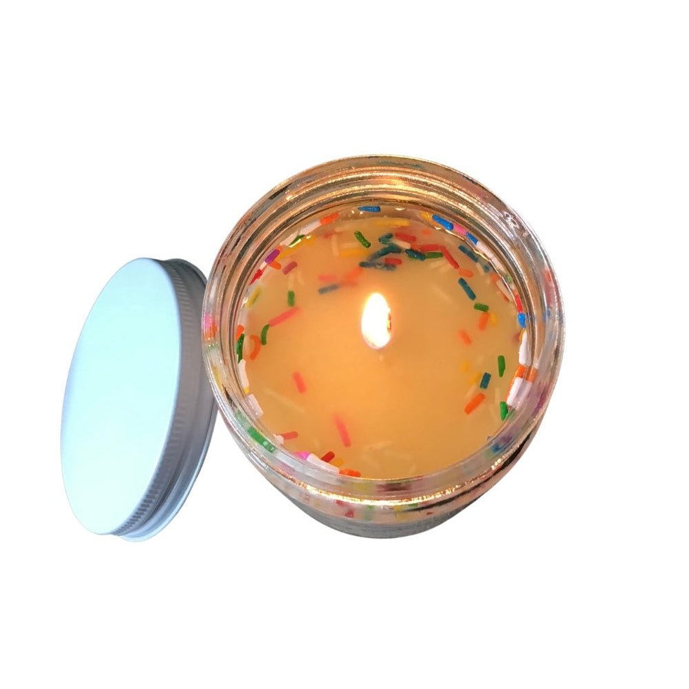We love our new confectionery sprinkle designed soy candles. These candles come in a 9 oz clear jar with a white metal lid. Available in 3 fragrances: Strawberry Shortcake, Vanilla Cupcakes and Chocolate Chip Brownie.